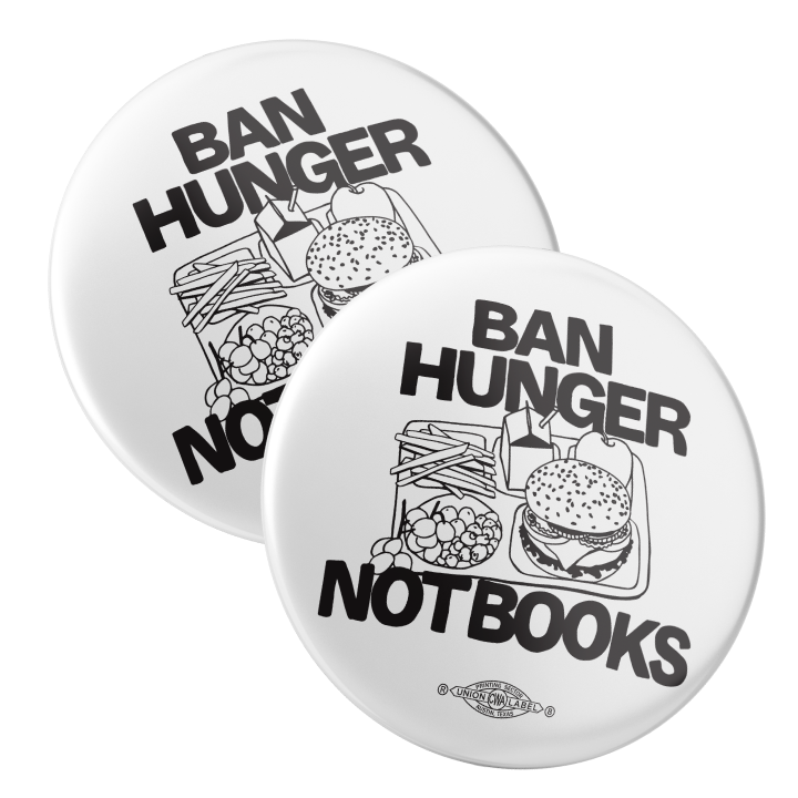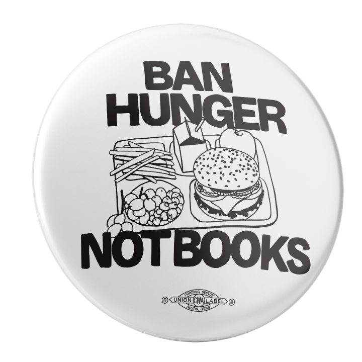 Ban Hunger Not Books pin-back button (2.25-inch diameter). Pack of two!